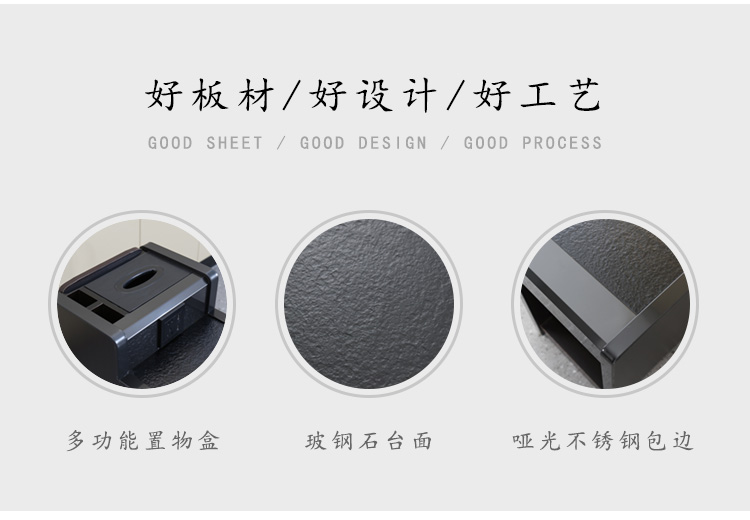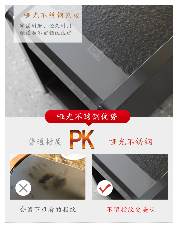 材質:啞(ya)光不銹鋼包邊(bian)、火燒石臺面、密度板材