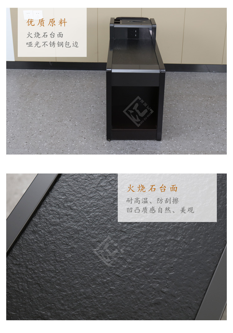 材質:啞(ya)光不銹鋼包邊(bian)、火燒石臺面、密度板材